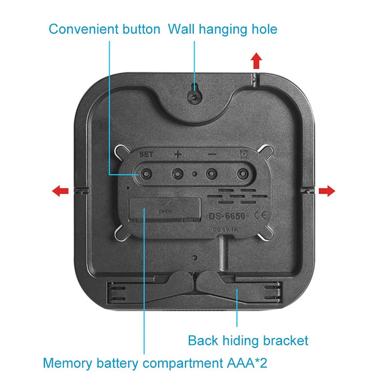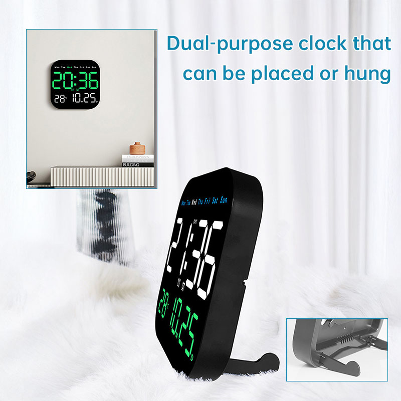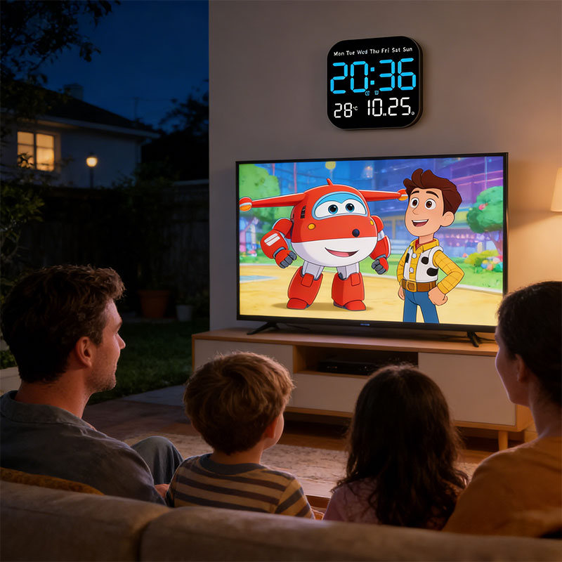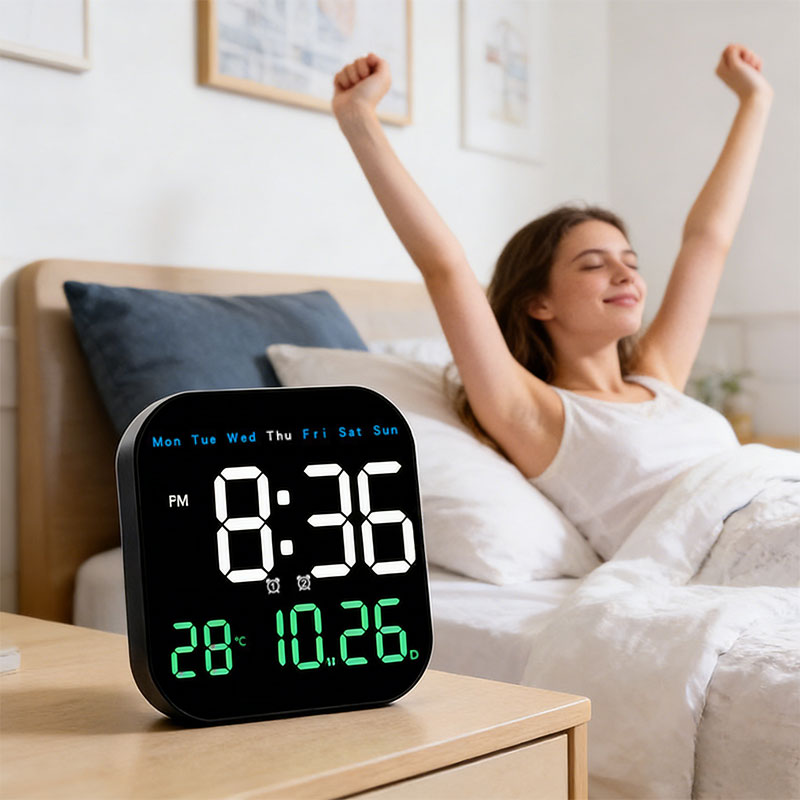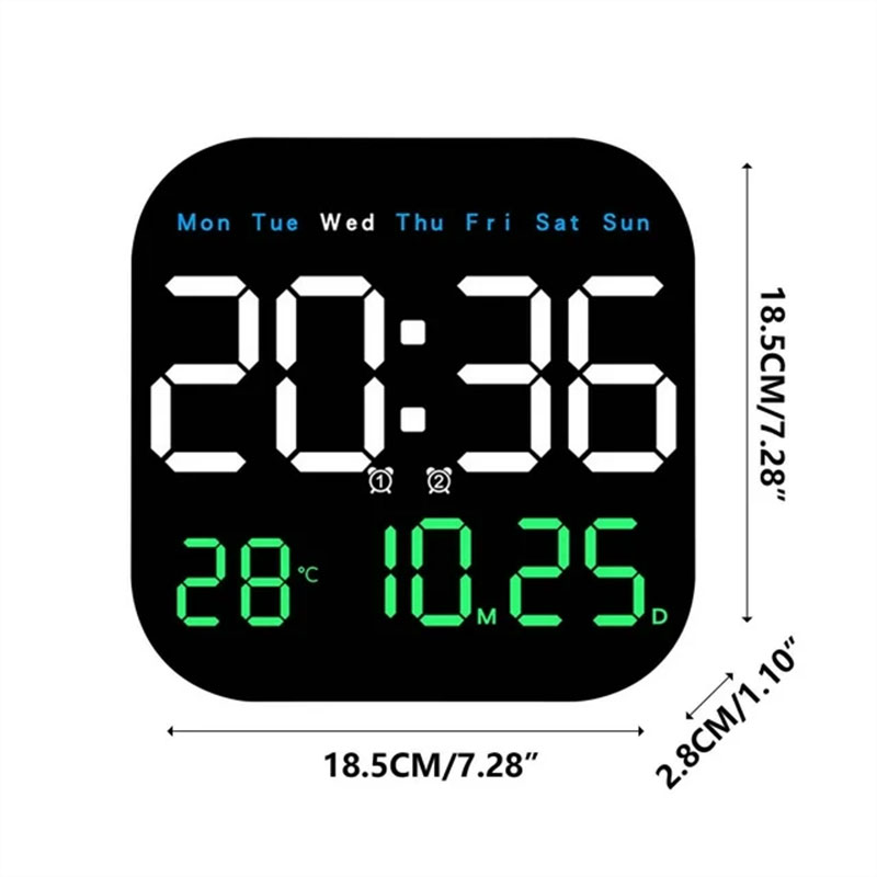 1. Large LED Display – Clear digital screen showing time, date, and weekday.