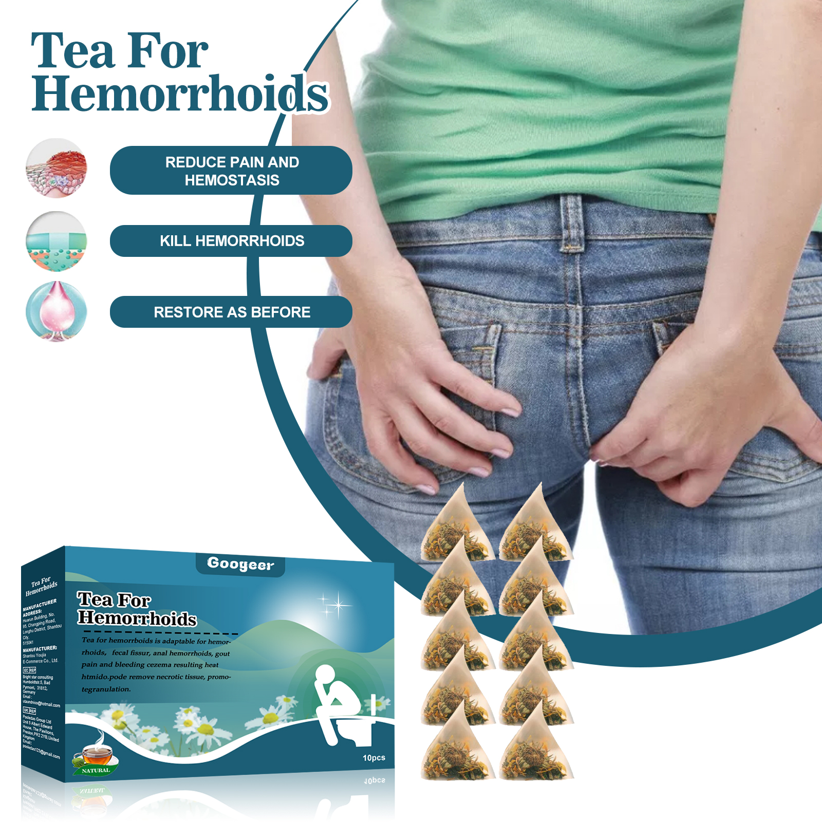 Our hemorrhoid tea includes Andrographis paniculata and Hedyotis alba. It can help reduce swelling, relieve pain, clear the intestines, and help with smoother bowel movements. The way to use it is very simple: just take 1 package of this product and soak it in hot water at 40-60 degrees Celsius for 3-5 minutes. And can be applied to hemorrhoids, intestinal fissure, anal hemorrhoids gout pain, bleeding eczema and other diseases causing heat pain.